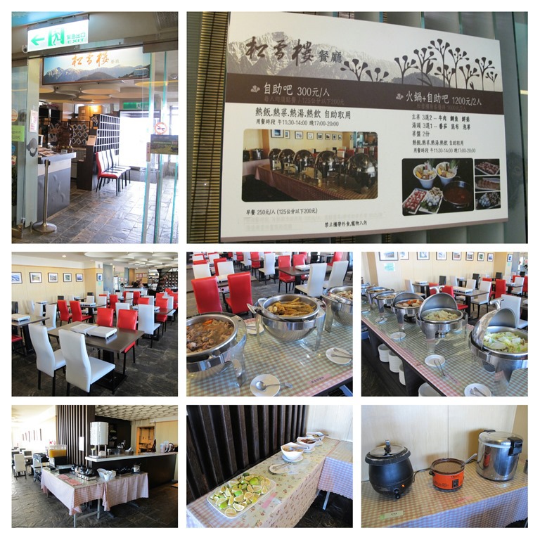 餐廳供應的餐點,以自助吧為主,含六樣菜色、白飯、古早味肉燥、味噌湯、水果、咖啡、果汁等等,早上則另有稀飯與吐司。不過,雖然看起來很豐盛,一開始吃得很開心,但在連續吃了六餐以後,其實越來越失望,因為六樣菜色中,幾乎都是燉雞肉、炸柳葉魚、白蘿蔔、花干、白菜、榨菜肉絲、鮮菇黃金筍在輪,沒什麼新菜色,很快就吃膩了,但考慮到在高山地區還能有如此服務,只能懷抱著感恩的心就食了。除了自助吧以外,餐廳另提供小火鍋,菜色還不錯,但因為這需要額外加價,所以我們就沒點了。