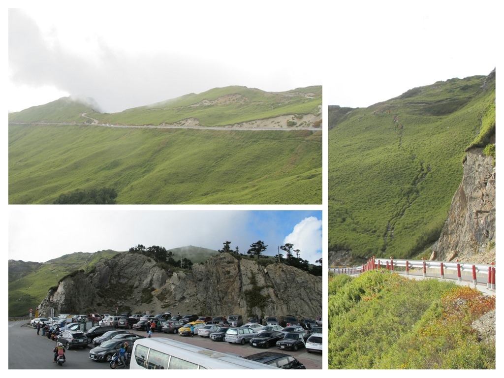 合歡山主峰登山口,其實不只一個,就我們所知道的,共有左上的柏油路、圖右的陡坡,還有圖左下武嶺旁的岩壁路三處。三個登山口中,只有第一個蜿蜒緩上的柏油路,才是官方所標示的主峰登山口,至於其他兩個,一個被擋三角錐,另一個則是被設置立牌禁止通行。