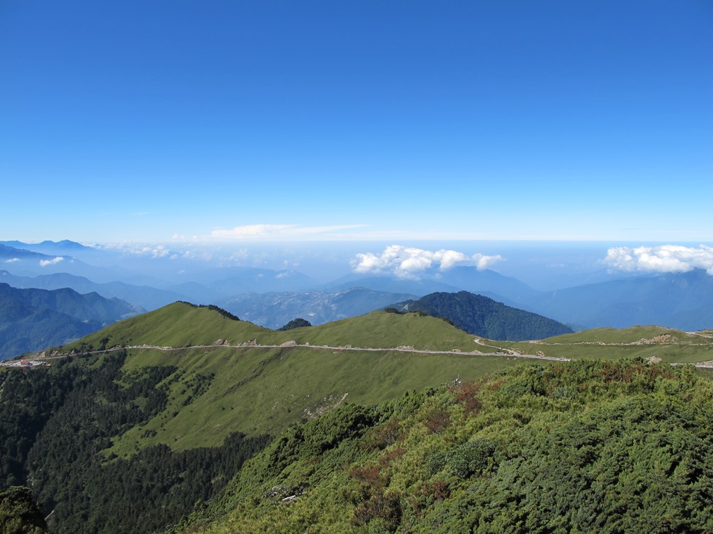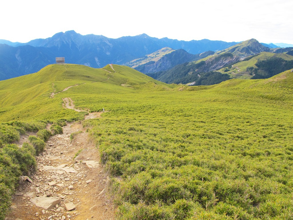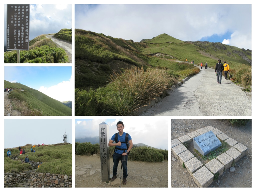 合歡山主峰步道,基本上緩斜坡居多,因此算蠻好走的,幾乎沒什麼難易度,很適合闔家大小來此散步健行,不過因為相對平緩,蜿蜒蛇行地繞路不免長了一點,即便如此,大概走不到一個小時,就可以到達最高點。一路沿著坡道緩上,抵達第一座哨口的同時,大概就快到山頂了,然後再依序經過生態廁所和通訊站,順著階梯爬上去,便可以看到象徵著合歡山主峰的立柱,以及旁邊的三角點,至此,合歡山上第一座百岳,攻頂成功。