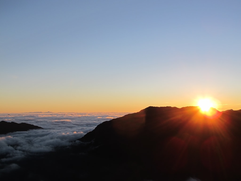 站在石門山的山上,欣賞從雲海中升起的日出,的確是合歡山上一大美景,不過,從圖中可以觀察到,此刻的日出,多多少少還是被前方的屏風山給擋住了,頗令人感到美中不足,當下浮現著這個疑惑:石門山,真的是最適合看日出的合歡山群峰嗎?