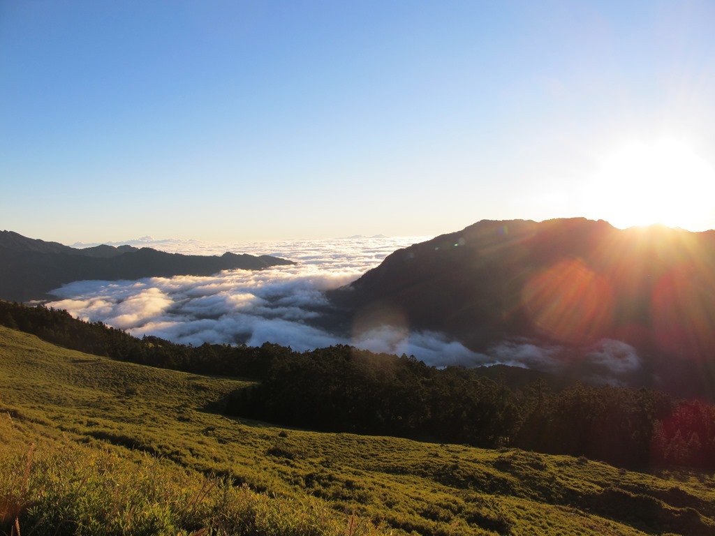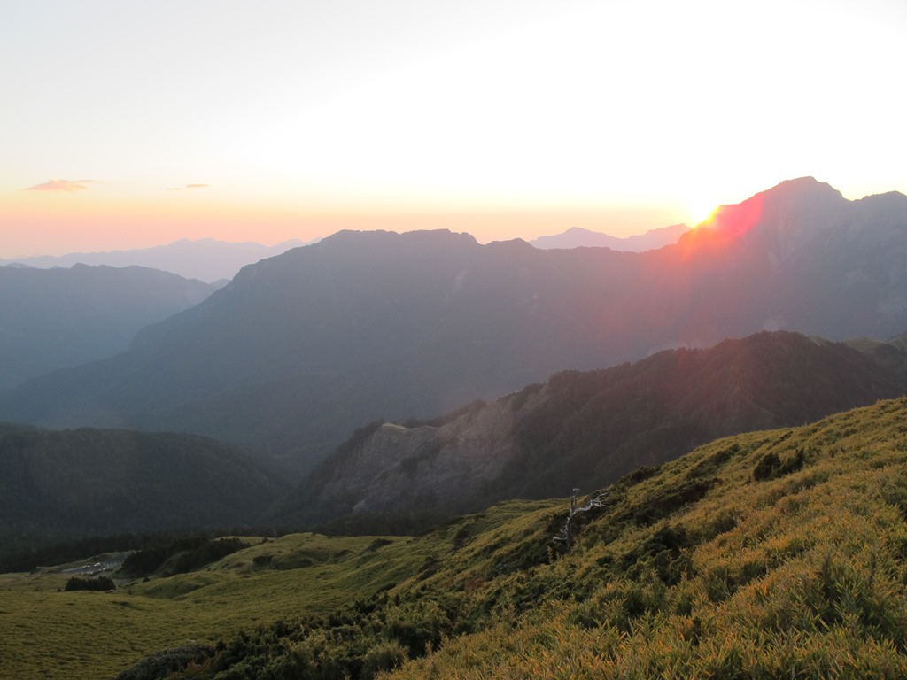 合歡主峰在地理上的相對位置,位在群峰的西邊,往西面望去,沒有其他更高的山頭擋在眼前,因此很適合看夕陽,如果再搭配上雲海,畫面就更美侖美奐了。只可惜我們這次登主峰看夕陽時天候不佳,雲層太厚遲遲無法散開,因此沒辦法目睹這美麗的一幕,令人頗感失望。