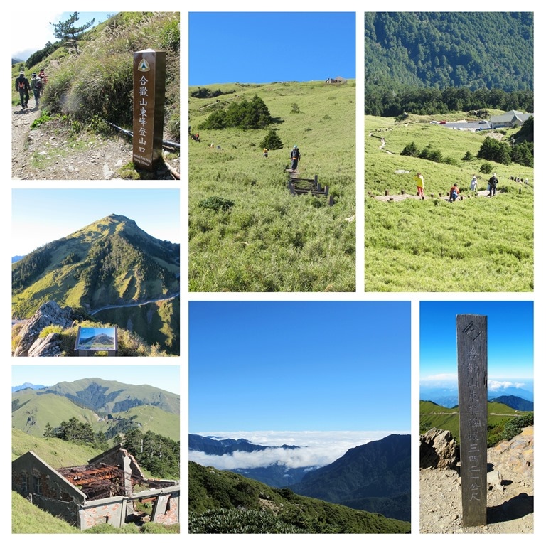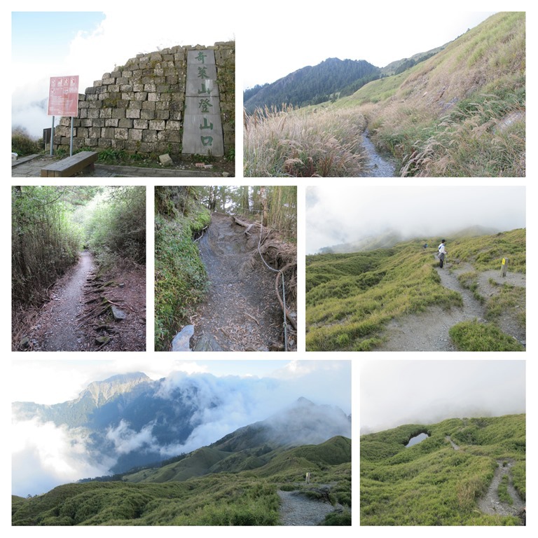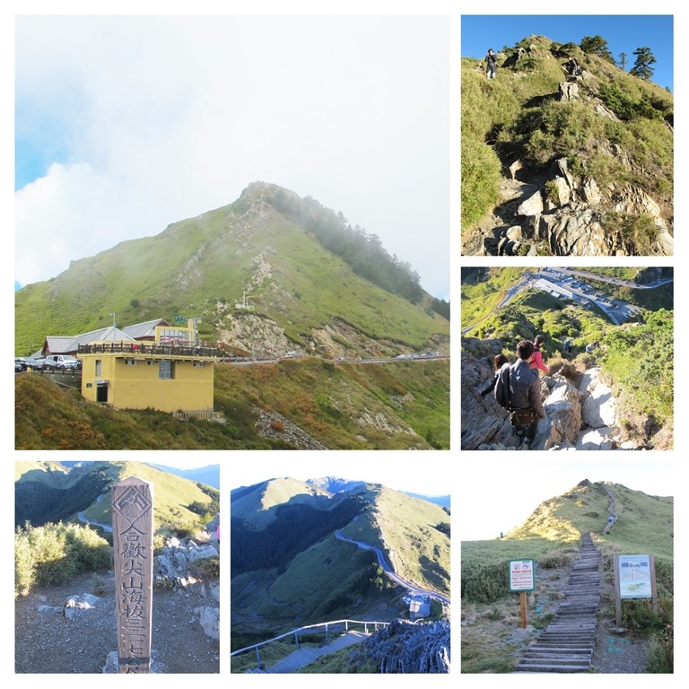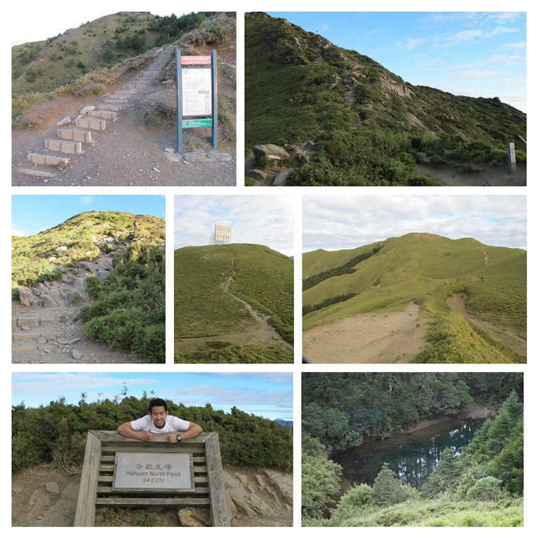 從石門山下來後,對面正好有通往合歡尖山的步道,估計離早餐時間還有半個鐘頭,就決定順手把這座小山給一起解決。這一面的步道,如圖中右下角所示,是屬於木造階梯型的人工步道,只要順著階梯穩健地向上爬,便會成功抵達最高點,但這邊不得不說,實際上步道還蠻陡峭的,中間其實停頓了不少次,稍微喘口氣恢復心跳以後,才接著繼續前進。