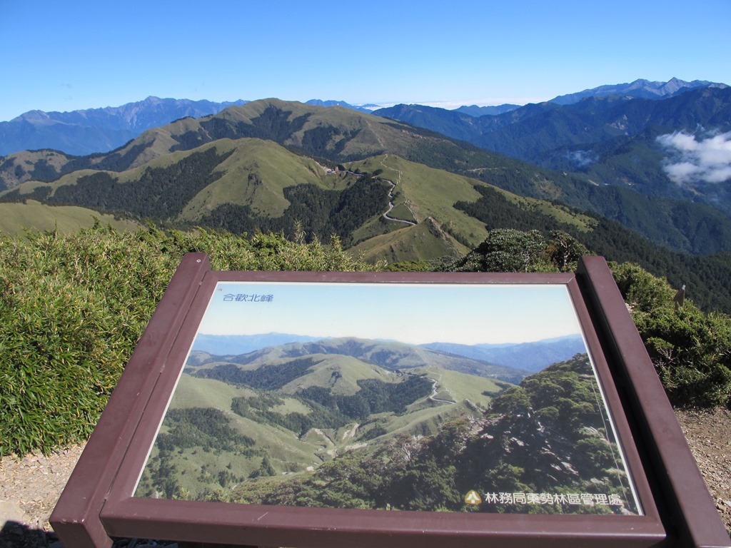 合歡北峰上的景色,還蠻遼闊的,不僅可以將合歡群峰與奇萊群峰盡收眼底,更可以眺望前方的福壽山農場,還有遠方的雪山群峰,將視野給推到更北邊,個人衷心認為,合歡北峰上的景色在合歡群峰中,可以說是數一數二的,不造訪實在可惜。另外,途中經過反射板附近時,遇到有人從架設好的帳篷出來,可能是來露營,可能是來攝影,總之看起來真愜意。
