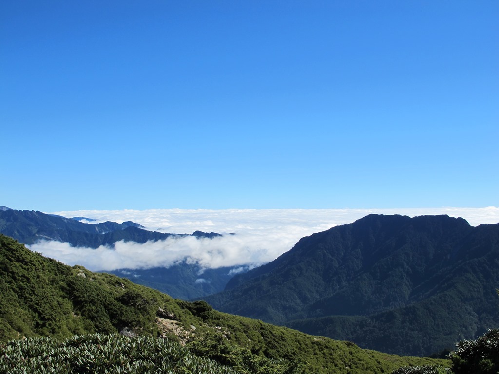 攻上合歡北峰後,先拍個照留個紀念,也趁此稍作休息,以應付接下來的西峰長征,不過考慮到西峰折返,聽說會花不少時間,因此這邊只敢稍微停留,沒待多久就啟程出發,踏上前往合歡西峰的路。一開始,先是寬廣的箭竹草原步道,往下朝最低鞍部前進,因此走得十分愜意,但接下來,會遇到兩段陡坡拉繩,必須視情況拉著繩索,慢慢地下去通過陡坡。此時雖然走得游刃有餘,但想到後面回程時還要反向往上爬,就感到頭痛。