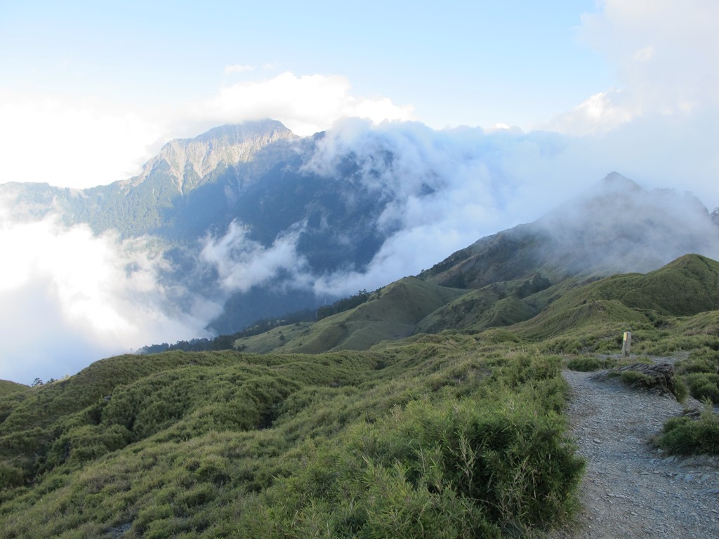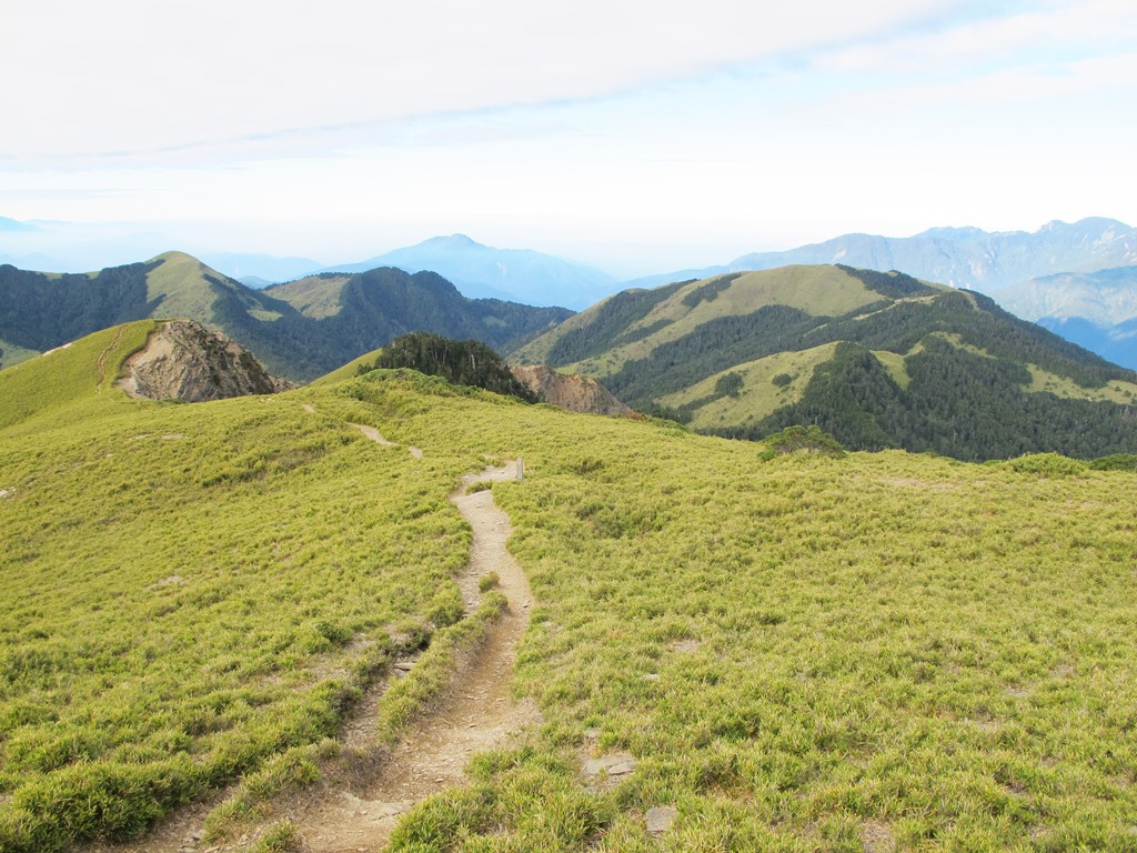 飯後悠哉地先睡個午覺,然後才在醒來後仍對床鋪感到留戀之下,打起精神整理著裝,準備向旁邊的奇萊山登山口前進。下午的天氣雲霧漸起,豔陽不在,因此稍感涼意,在這種天候下行走,其實還蠻愜意的。一開始先是一段平緩向下的草坡道,走得很輕鬆寫意,接著進入冷杉林,走在兩側綠意盎然的小徑裡,最後才是一片寬廣的玉山箭竹原。前方遼闊的草原風光盡收眼底,再搭配上遠方險峻的奇萊連峰,這景色好不壯闊。