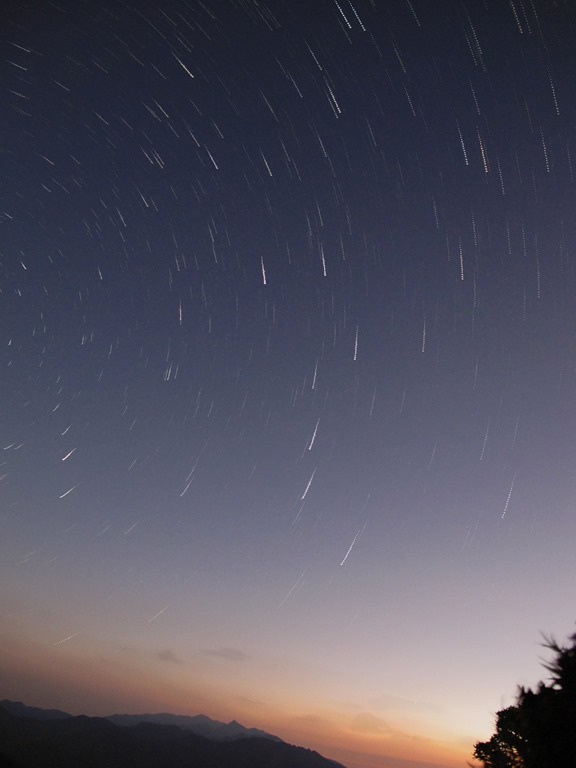 關於上面的星軌圖,必須先在這邊強調一點,若是在北半球觀察,星軌會是走逆時鐘,而不是上圖看似的順時鐘,千萬不要被圖給騙了。之所以會有這種錯覺,是因為拍攝時間點的關係,最後一張的縮時攝影,離日出只剩下半個小時,因此亮度上比較黯淡,呈現在圖片上便是像素較少,因此在經過圖片合成後,便會形成一張起點亮,終點暗的星軌,如此便看起來好像是逆著走一樣,但事實上並不是這樣。雖然沒能拍出正規的星軌圖,但卻意外地拍出這種另類的星軌,也算是一種獨特的經驗了吧,哈。