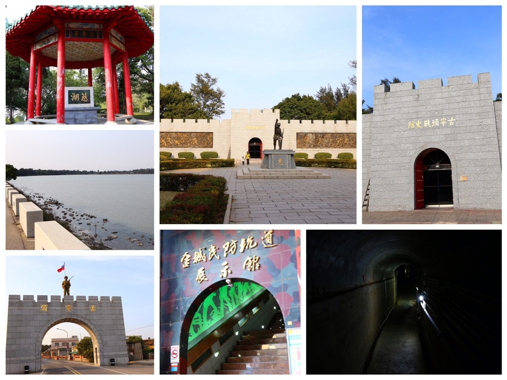 造訪完上述景點後,大致上小金門這邊都逛得差不多了,時間上也來到了三點左右,於是便繼續以順時針方式環島,返回九宮碼頭,坐船回金門本島去了。下一個景點,是位於金寧鄉的古寧頭戰史館,由於依稀記得五點是閉館時間,於是下船以後,便馬上匆匆忙忙騎車趕過去,避免向隅。路上途經慈湖,便順勢下去走走,不過我個人覺得慈堤更值得一遊,左邊是海,右邊是湖,令人印象深刻。古寧頭戰史館,外觀上同樣也是城牆造型,不過前方還多了個小兵雕像,頗具造型。裏頭述說著當年共軍來襲,國軍於古寧頭包圍殲滅敵軍的戰史,其中包含文字介紹和影片播放。除了戰史館本身,附近還有個古寧頭牌樓,位在回去金城鎮的道路上,蠻特別的。