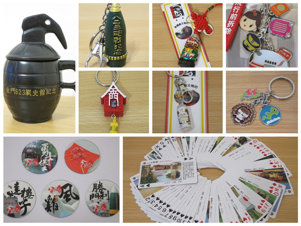 這次金門之旅,造訪了不少觀光景點,同時也買了不少極具當地特色的紀念品,作為這次旅行的紀錄留念,如左上角手榴彈造型的杯子、右下角關於金門風獅爺以及觀光景點的撲克牌、左下角的烈嶼景點磁鐵,還有右上角零零總總的小飾品,都很有金門當地的味道,在其他地方是看不到的。小弟出外旅行,很喜歡買這類的紀念品,儘管事後通常不會再拿出來把玩,但總覺得買了這些,就好像把這趟旅行在當地的回憶,給一起帶回來了。